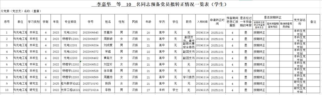 经过党支部对预备党员1年的培养教育和考察,经支部委员会研究确定,报必赢626net入口首页党委审查同意,将于近期召开党员大会讨论李嘉华等10名同志预备党员转正,特在必赢626net入口首页范围内进行公示。