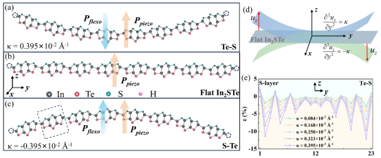 该研究团队通过第一性原理计算探索了压电 Janus In2STe单层中的挠曲光伏效应,其中电子结构和极化强度随着应变梯度的变化极其敏感。优异的柔韧性,较高的面外压电系数,以及挠曲电系数共同支撑了该体系强大的力电耦合功能。利用这一特性,该研究团队构建了一种偏振敏感光电探测器模型,该探测器通过挠曲光伏效应产生自供电光电流,并通过压电-挠曲电协同耦合将其放大近两个数量级。这种耦合可以调节至竞争状态,从而产生独特的自整流功能。最后,研究团队通过对光生载流子的动态调控,构建了一个具有更高数据密度的三通道光通信系统。这项工作为新一代智能柔性光电子器件的优化设计提供了一种有效途径。
