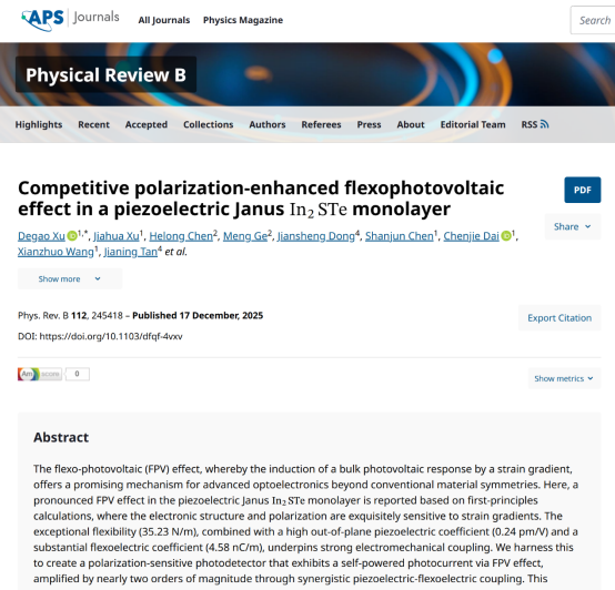 近日,我院徐德高教授完成的研究成果以题为“Competitive polarization-enhanced flexophotovoltaic effect in a piezoelectric Janus In2STe monolayer”在物理学自然指数期刊Physical Review B上发表。长江大学为第一单位,我院徐德高教授为第一和通讯作者,我院杨文星教授和湖南师范大学欧阳钢教授为共同通讯作者。