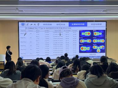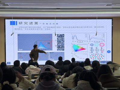六位不同学院的主讲人依次分享了各自的研究工作。必赢626net入口首页潘越扬同学分享碳基材料光致发光研究,详细介绍了研究中的实验方法与阶段性探索成果;王赛飞同学则聚焦过渡金属氰化物的结构与电子性质,分享了该方向的基础研究进展。