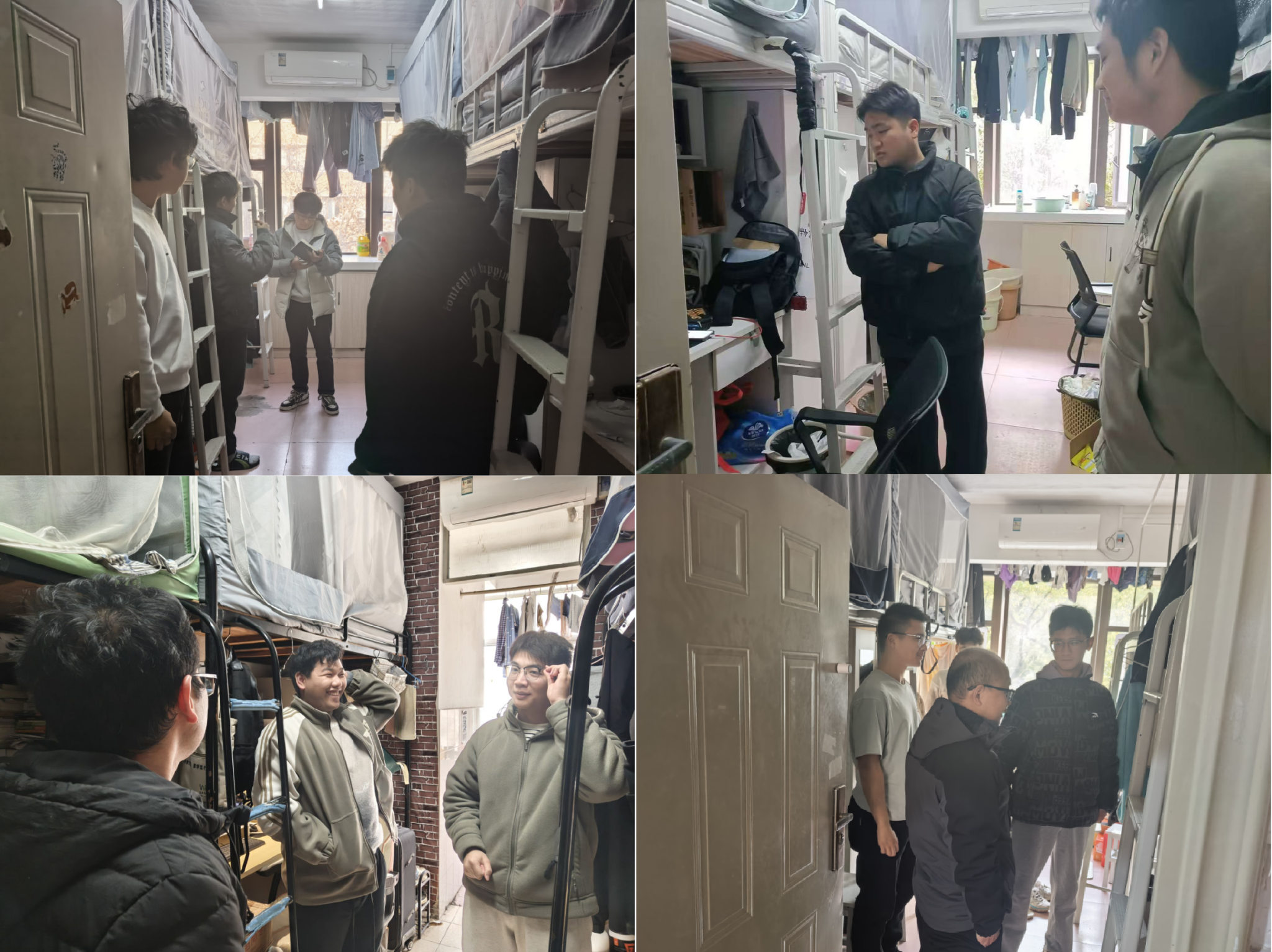 走访过程中,老师们与学生亲切交谈,重点关注期末复习备考进度,细致了解学生学习困难与备考压力,尤其对大四考研学生开展针对性关怀,及时疏导考研失利学生情绪。同时,老师们仔细排查宿舍用电安全、消防隐患等问题,关切询问学生住宿环境、饮食作息情况,提醒大家做好冬季保暖,严守宿舍禁烟禁酒规定。针对即将到来的元旦假期,老师们详细了解学生出行安排,着重强调出行安全与防诈骗、消防安全意识。